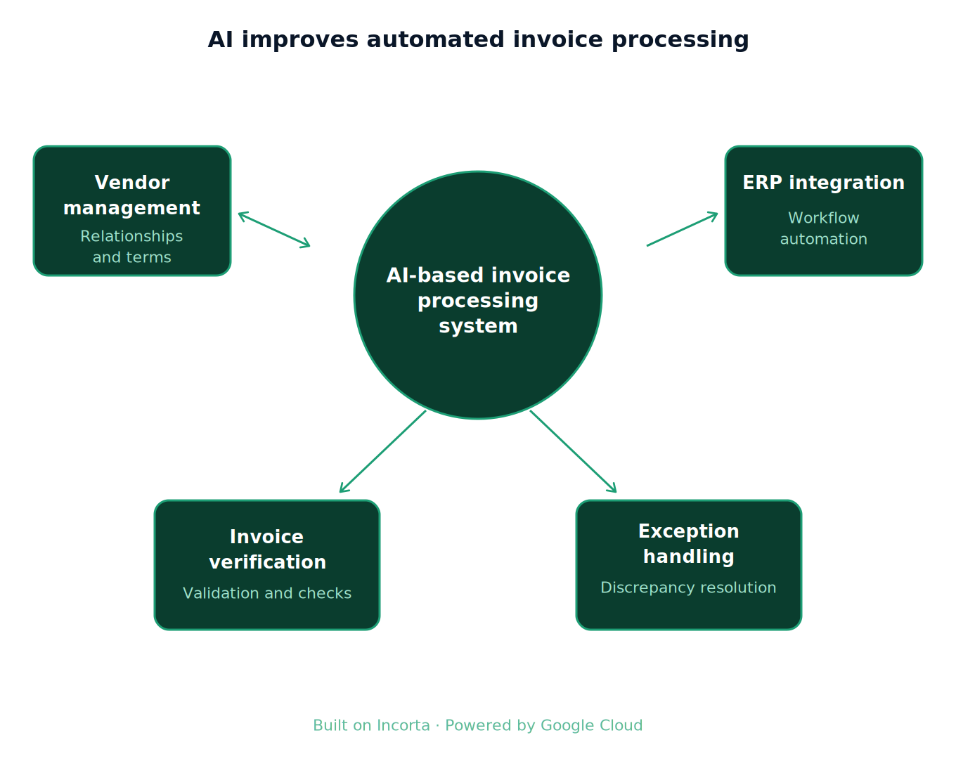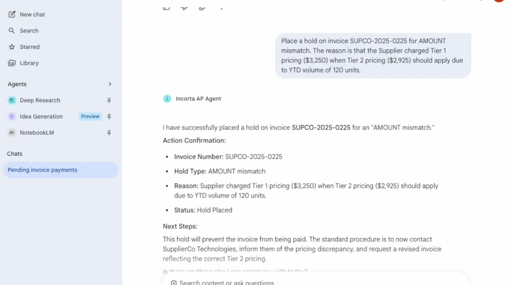 The A2A (Agent-to-Agent) protocol, developed through the Incorta and Google Cloud partnership and introduced at Google Cloud Next, establishes a standard for agents to share context and coordinate decisions. When the AP Agent flags a pricing mismatch, it doesn't just log a ticket. It sends a structured request to a contract validation agent, passes the relevant invoice and supplier terms as context, receives a response, and acts - all without a human in the loop.