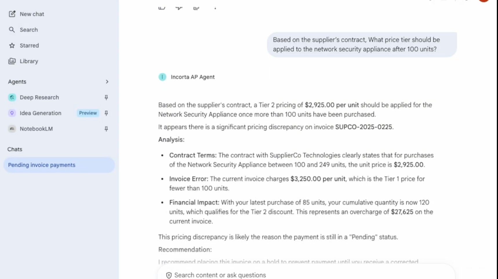 - Cross-references contracts, POs, and supplier terms without human prompting