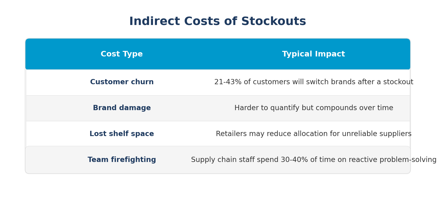 Stockouts create both direct and indirect costs: