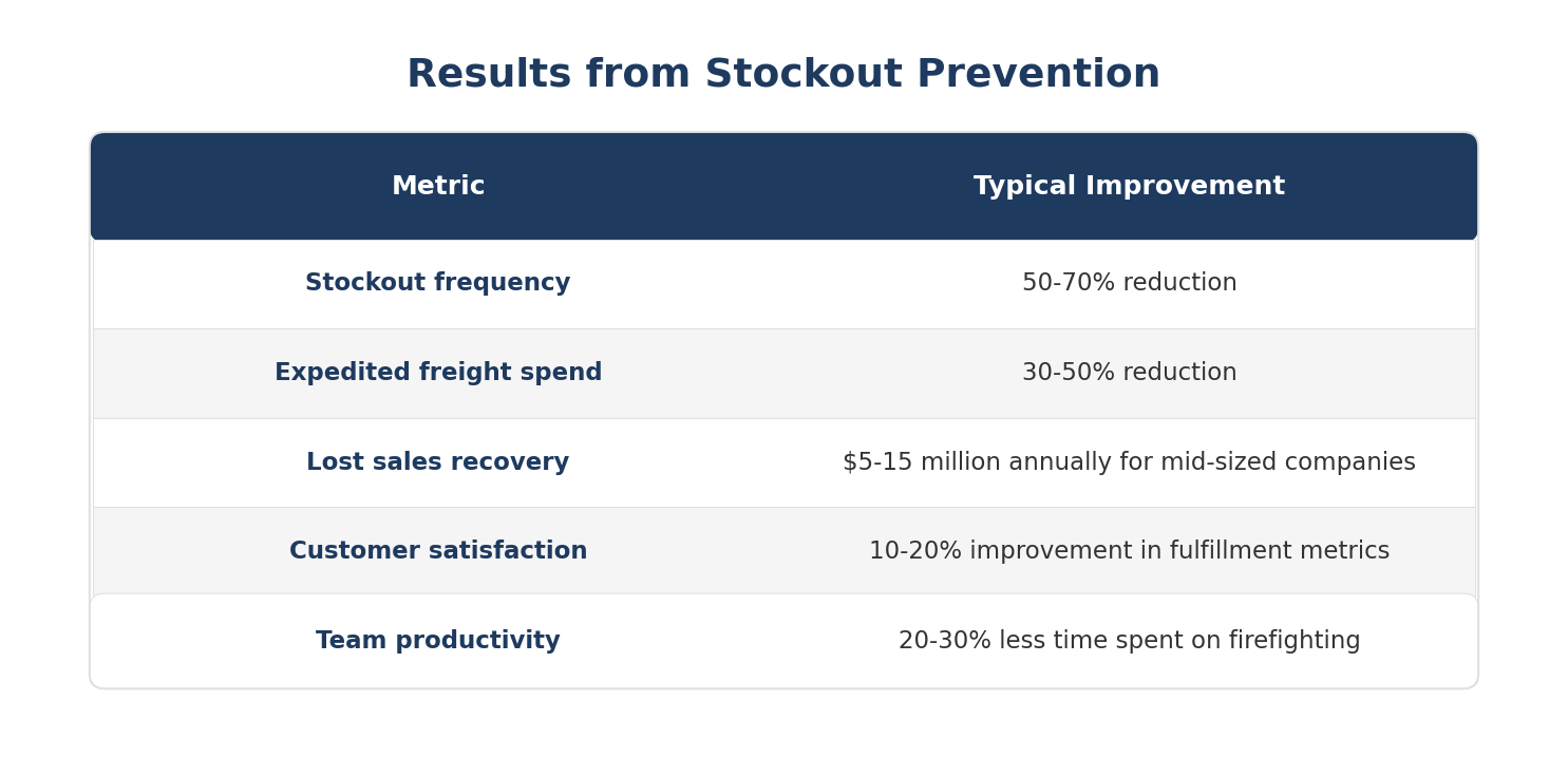 - Companies that implement proactive stockout prevention typically reduce stockout frequency by 50-70%